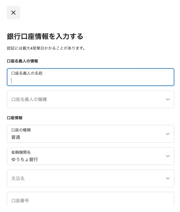 Squareは外資系の決済サービスですが、日本の銀行システムに則って口座情報を入力する必要があります。