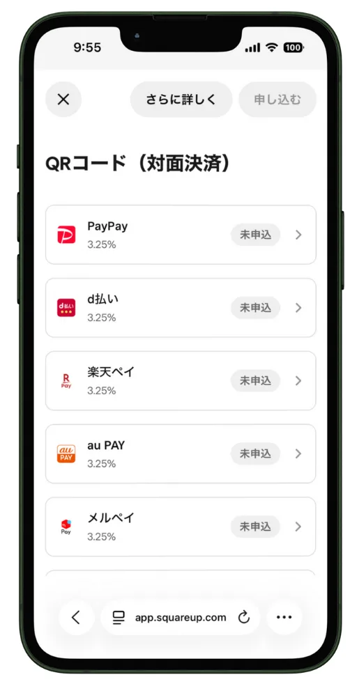 Squareは、申込だけでなく、QRコード決済の利用申請も簡単に行うことができます。